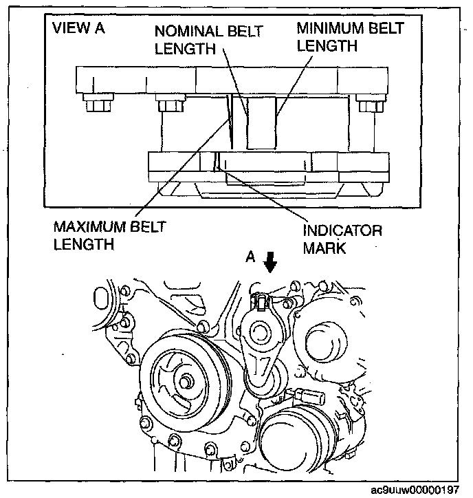 ^ When the generator and A/C drive belt is replaced with a new one, the drive belt auto tensioner indicator mark is aligned with the nominal belt length mark.