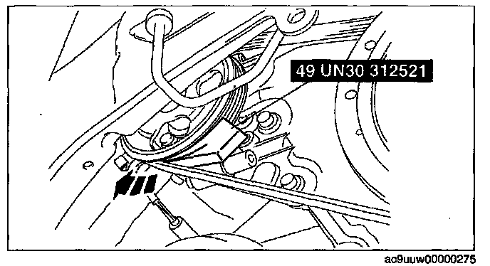^ Hold the SST by hand until it is lodges between the power steering oil pump pulley and power steering oil pump drive belt.