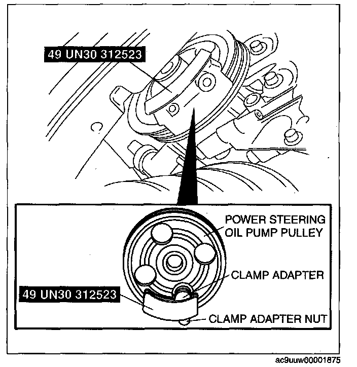 ^ There is no need to remove the clamp adapter nut completely when positioning the SST on the power steering oil pump pulley.