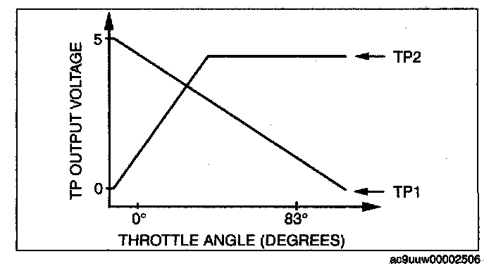 5. Operate the accelerator pedal and verify that the TP1 or TP2 PID (voltage) changes as shown in the following graph.