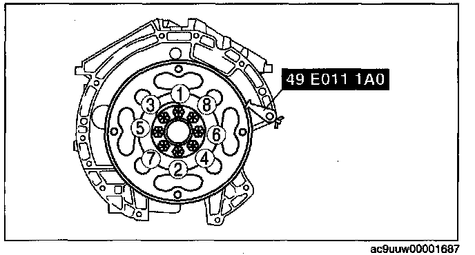 Tighten the new drive plate mounting bolts in two or three steps in the order shown.