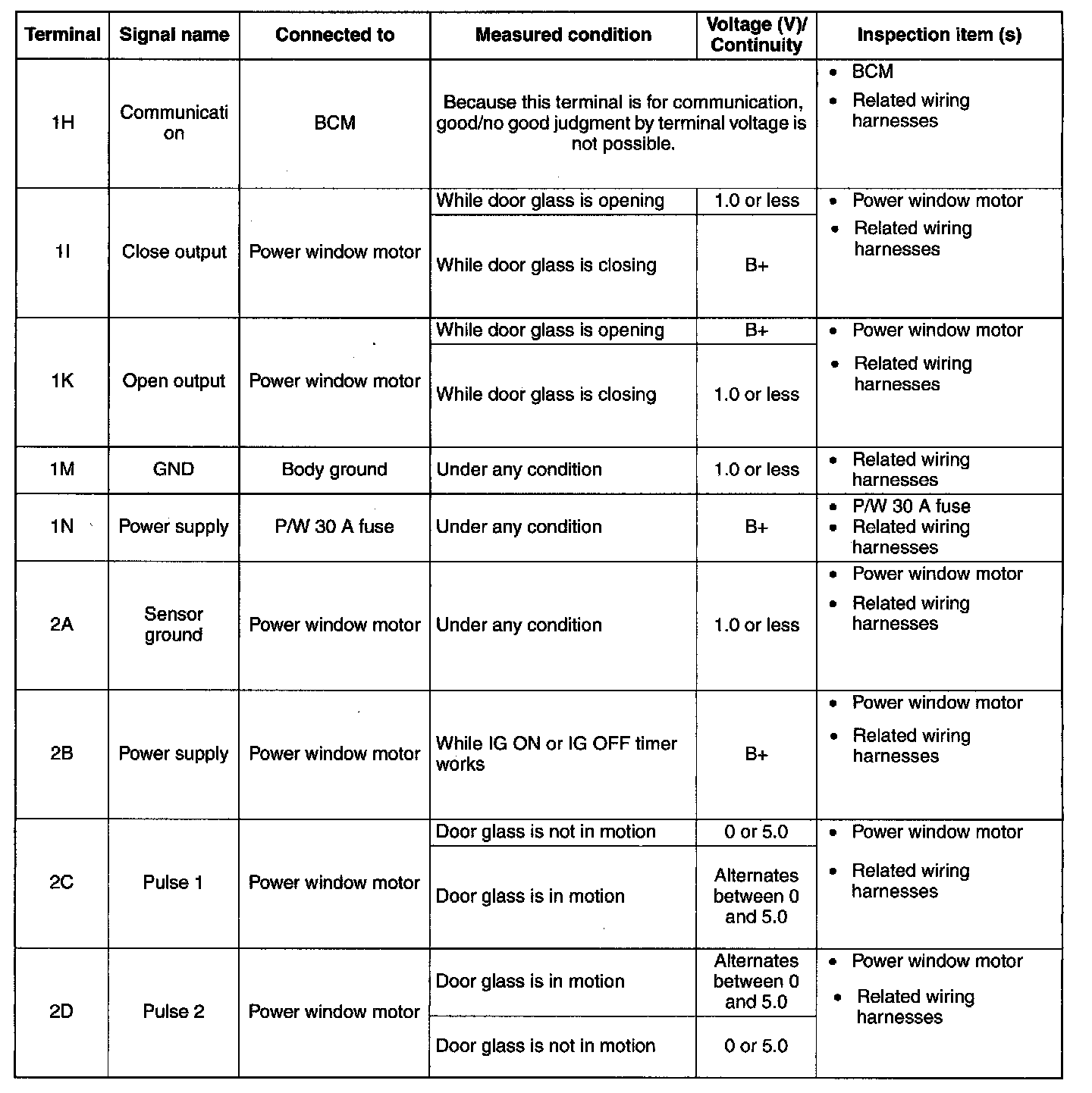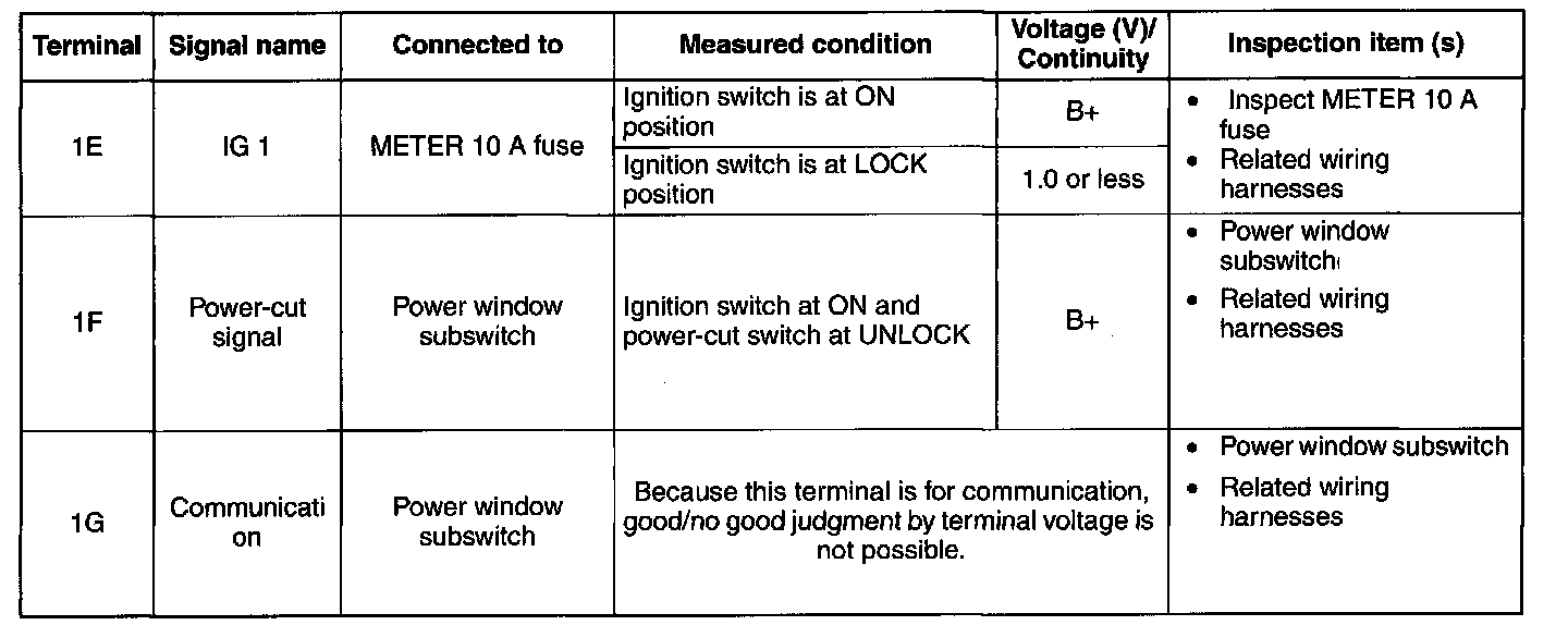 - If the voltage is not as specified in the Terminal Voltage Table, inspect the parts under "inspection item(s)" and related wiring harnesses.