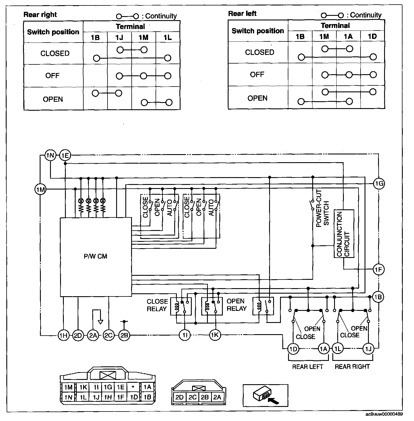 3. Inspect for continuity between the power window main switch terminals.