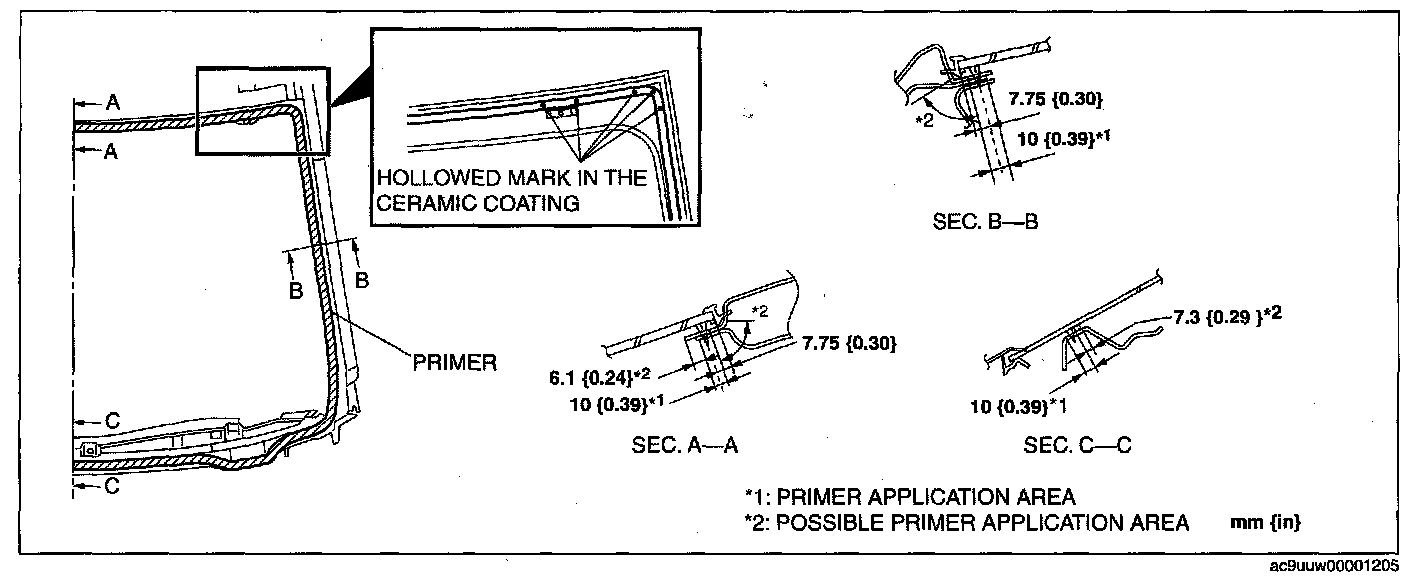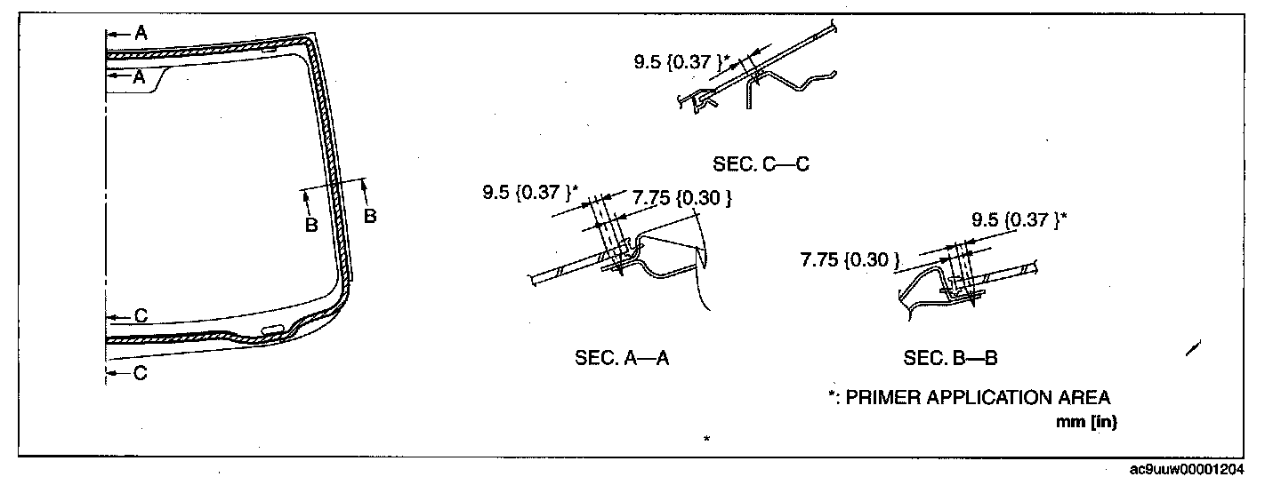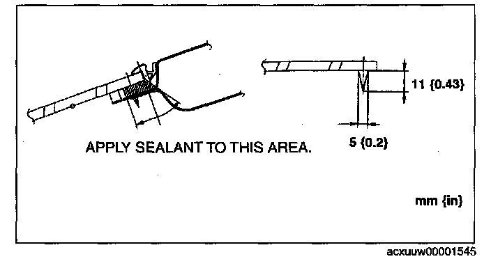 9. If the sealant has come off completely in any one place, apply some primer after degreasing, and allow it approx. 30 min to dry. Then apply 2 mm (0.08 in) thickness of new sealant.