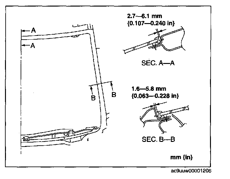 14. Verify that the clearance of the A-pillar is within the range shown in the figure, and press along the perimeter of the glass.