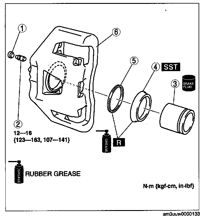 Warning: When blowing compressed air into the caliper body, the piston may pop out and cause injury if not supported at the correct point. Securely support the piston friction surface by hand when blowing compressed air.