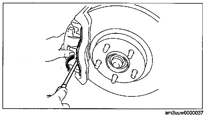 1. Move the retaining clip in the direction shown by the arrow using a flathead screwdriver and remove it from the caliper.