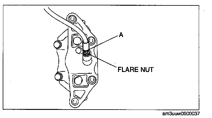 2. Tighten the flare nut while holding the brake hose at point A with a spanner or equivalent.