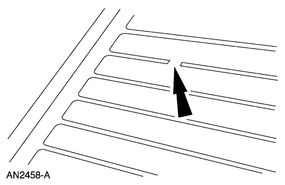 NOTE: The grid line material is not embedded into the glass but is baked to the glass surface and consequently can be scraped off. An undamaged grid line will have small ridges that project above the surface of the glass and can easily be felt when running a fingernail across them. Grid lines that have been "razor bladed" will feel smooth when a fingernail is dragged across the affected area. Inoperative lines may appear to the eye to be undamaged due to residue remaining on the glass and will require diagnosis with a voltmeter or 12V test lamp. For additional information, see Diagnosis and Testing.