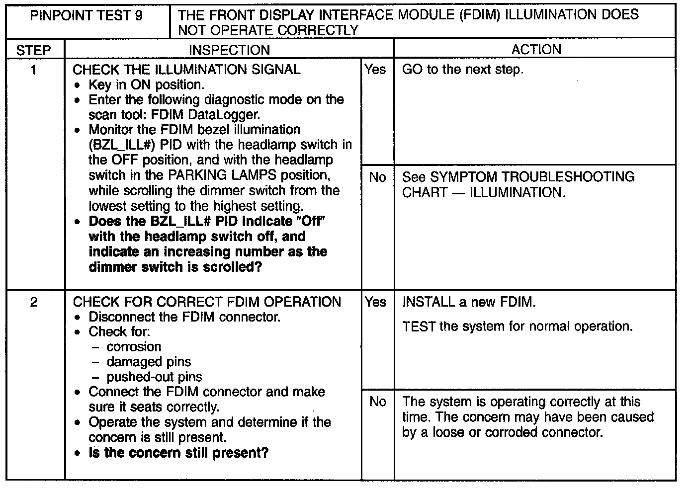 Pinpoint Test 9: The Front Display Interface Module (Fdim) Illumination Does Not Operate Correctly