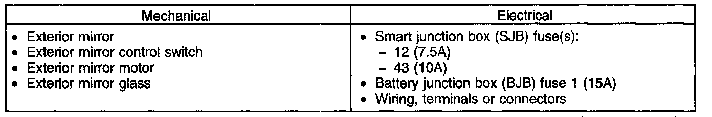 4. If the concern is not visually evident, verify that symptom and see SYMPTOM TROUBLESHOOTING CHART - POWER MIRRORS. Symptom Related Diagnostic Procedures