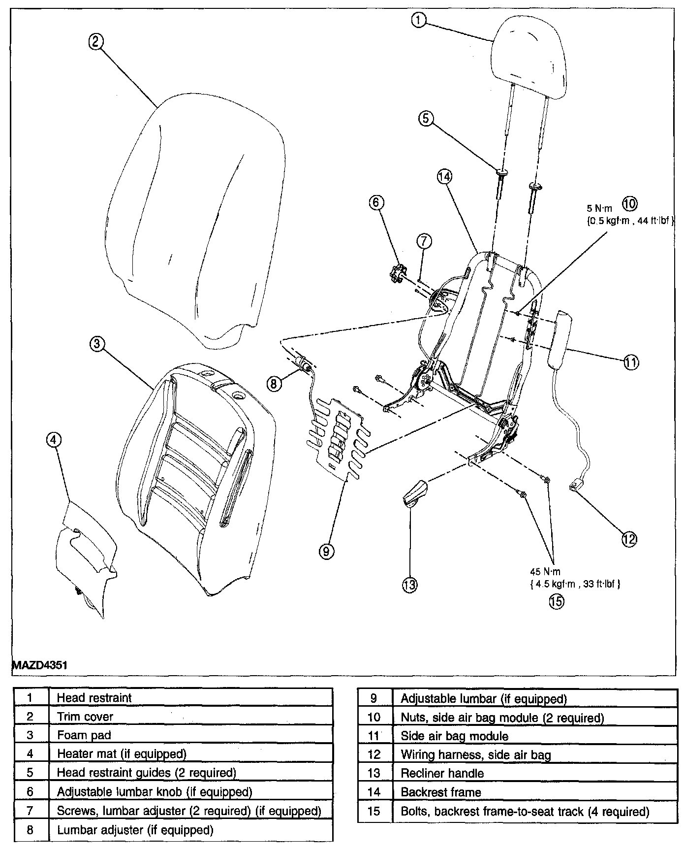 - If a side air bag deployment took place, a new seat back pad, trim cover and side air bag module and nuts must be installed. The seat back frame should be replaced if necessary.