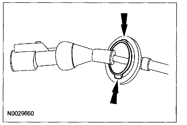 ^ When removing the body grommet, rotate the grommet into a position which allows the use of a small screwdriver to release the tabs on the underside of the body grommet. These 2 tabs are located at right angles to the sensor wire.