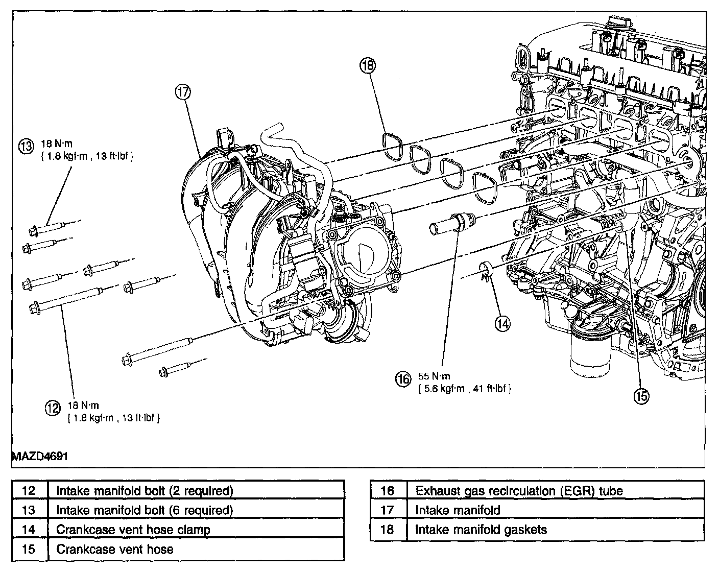 13. Remove the 8 bolts and position the intake manifold aside to access the crankcase ventilation hose clamp and the EGR tube.