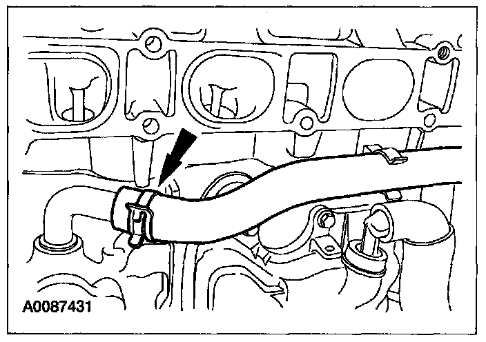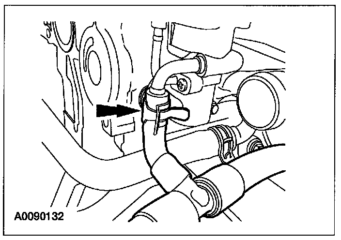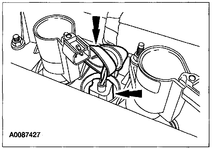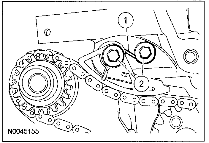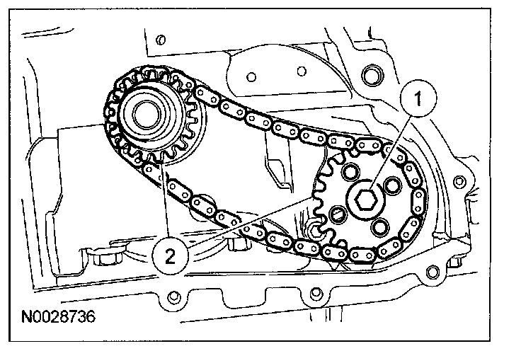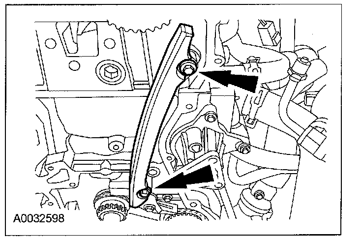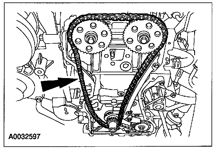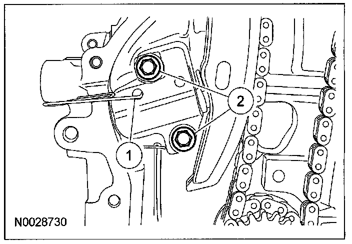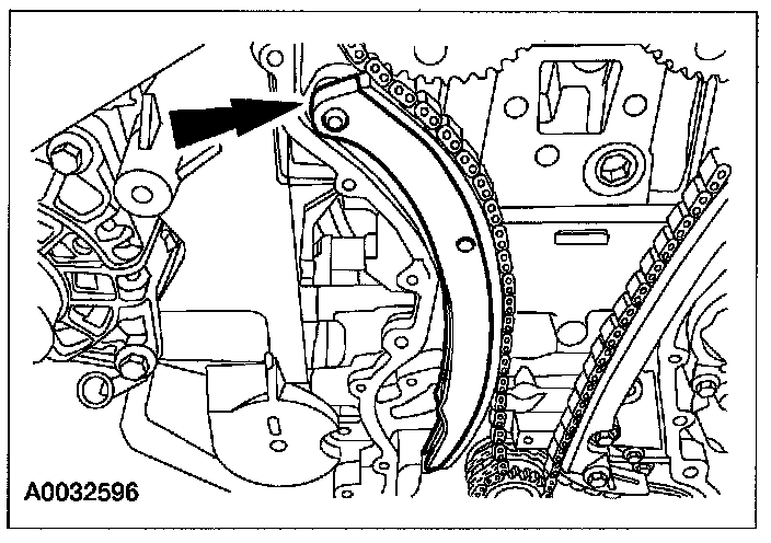 (1) Compress the timing chain tensioner, and insert a paper clip into the hole to retain the tensioner.