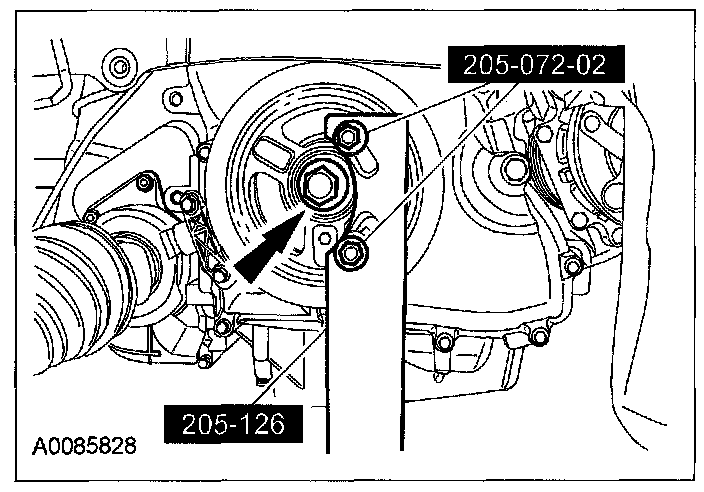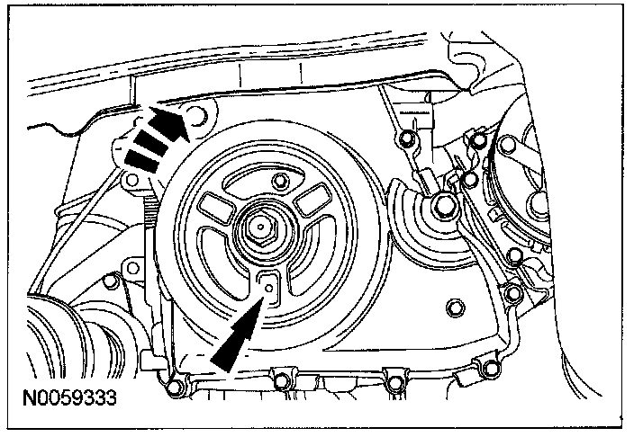 ^ The crankshaft must remain in the TDC position during removal of the pulley bolt or damage to the engine can occur. Therefore, the crankshaft pulley must be held in place with the special tool and the bolt should be removed using an air impact wrench (1/2-in drive minimum).