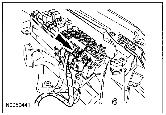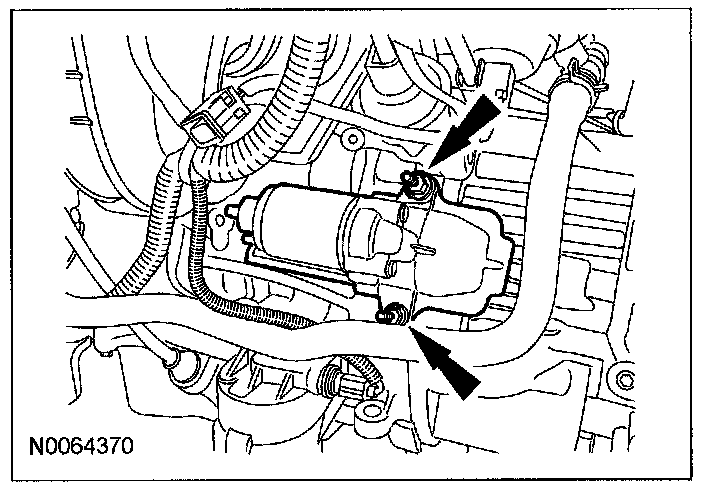 6. Install the wire harness clip retainer and the ground wire and nut to the starter bolts.