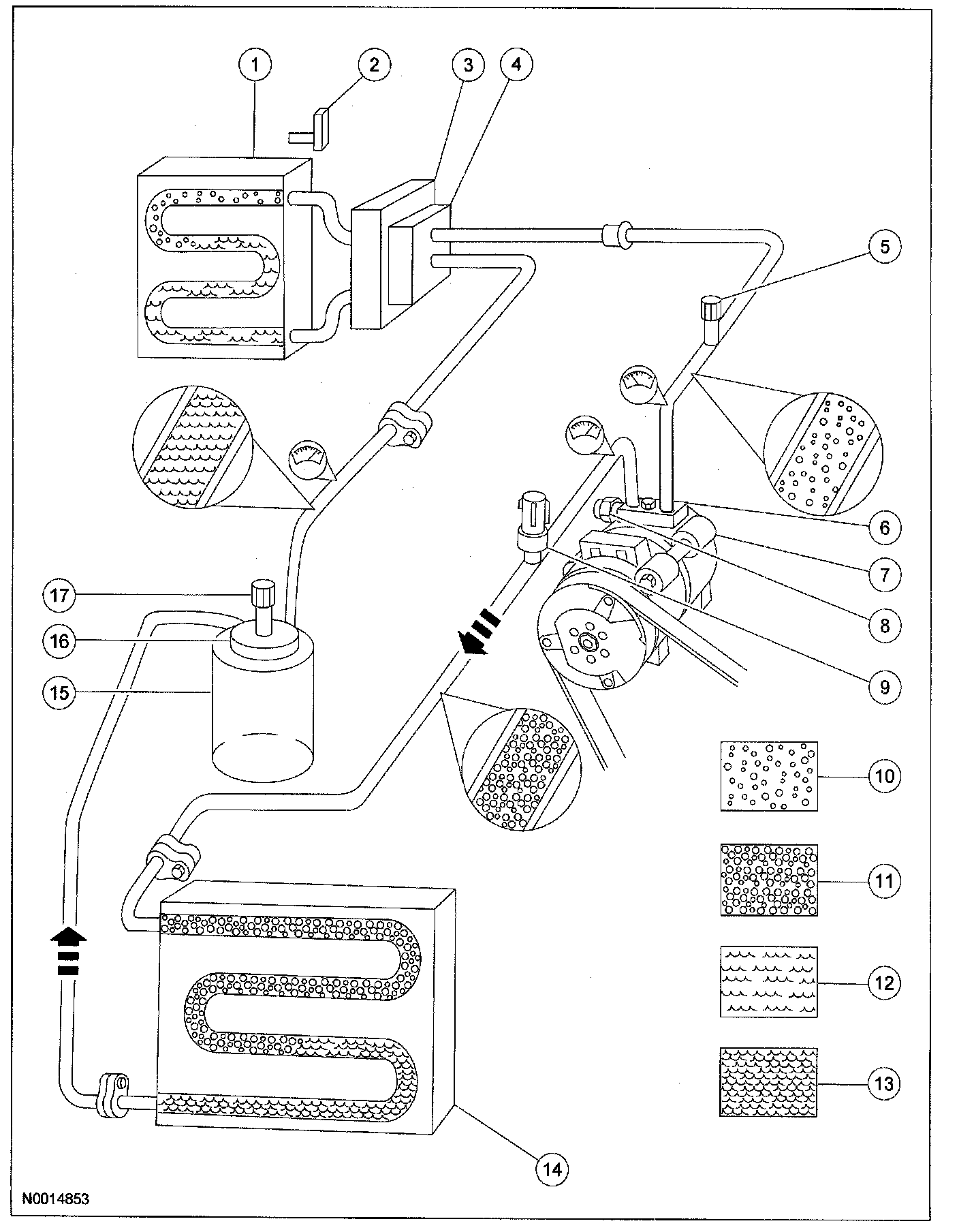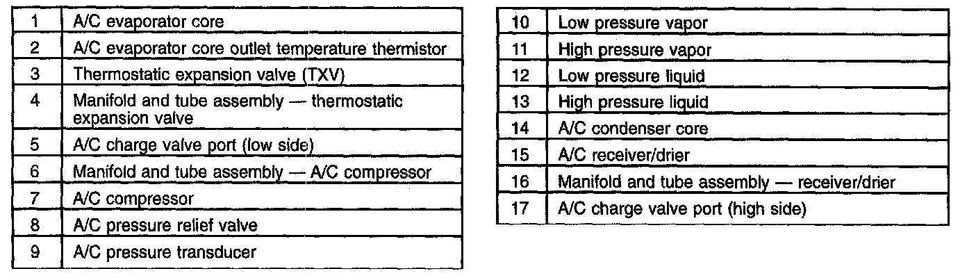 During stabilized conditions (air conditioning system shutdown), the refrigerant is in a vaporized state and pressures are equal throughout the system. When the A/C compressor is in operation it increases pressure on the refrigerant vapor, raising its temperature. The high-pressure and high-temperature vapor is then released into the top of the condenser core.