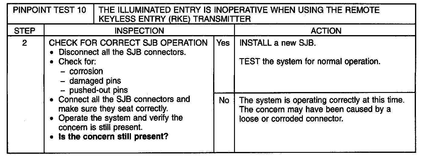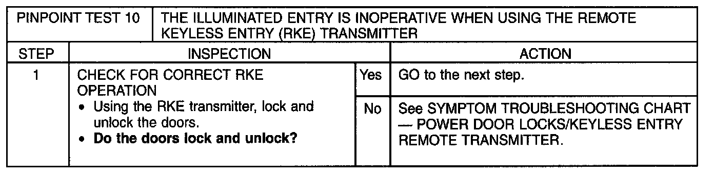 PINPOINT TEST 10: THE ILLUMINATED ENTRY IS INOPERATIVE WHEN USING THE REMOTE KEYLESS ENTRY (RKE) TRANSMITTERNormal Operation