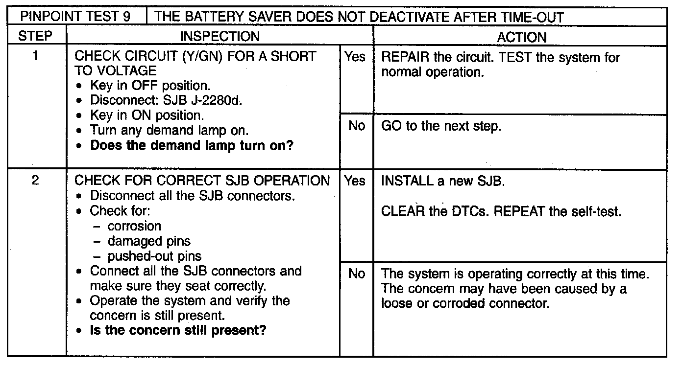 The smart junction box (SJB) provides a battery saver function. The battery saver function provides automatic shutoff of the interior lamps (demand lamps and glove compartment lamp) after a predetermined time has elapsed in order to save battery power.