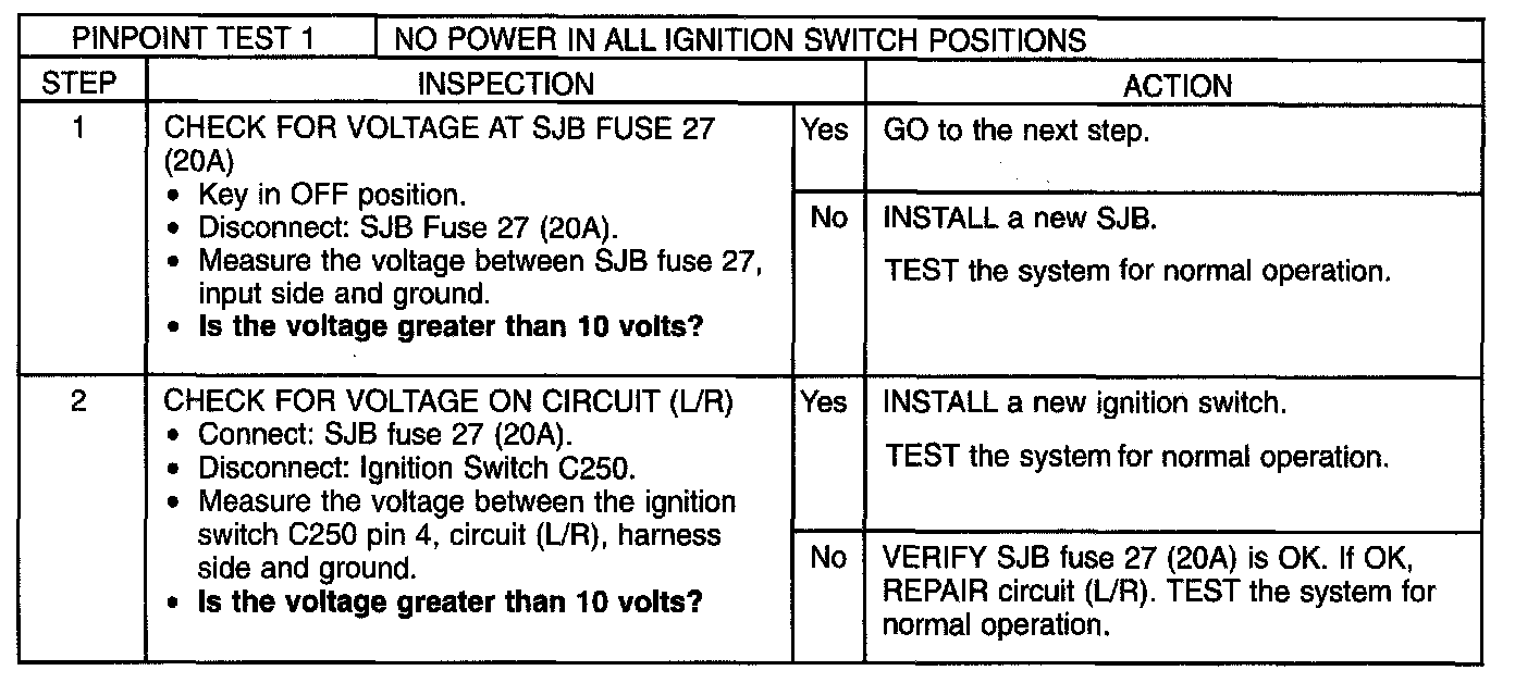 Pinpoint Test 1: No Power In All Ignition Switch Positions