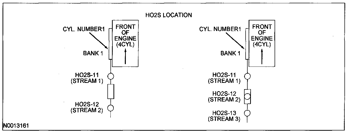 The number of HO2Ss used in the exhaust stream and the location of these sensors depend on the vehicle emission certification level (LEV, LEV-II, ULEV, PZEV). On most vehicles only 2 HO2Ss are used in an exhaust stream. The front sensors (HO2S11/HO2S21) before the catalyst are used for primary fuel control while the ones after the catalyst (HO2S12/HO2S22) are used to monitor catalyst efficiency. However, some partial zero emission vehicles (PZEV) use 3 HO2Ss for each engine bank. The stream 1 sensors (HO2S11/HO2S21) located before the catalyst are used for primary fuel control, the stream 2 sensors (HO2S12/HO2S22) are used to monitor the light-off catalyst, and the stream 3 sensors (HO2S13/HO2S23) located after the catalyst are used for long term fuel trim control to optimize catalyst efficiency (fore aft oxygen sensor control). Current PZEV vehicles use only a 4-cylinder engine, so only the bank 1 HO2Ss are used.