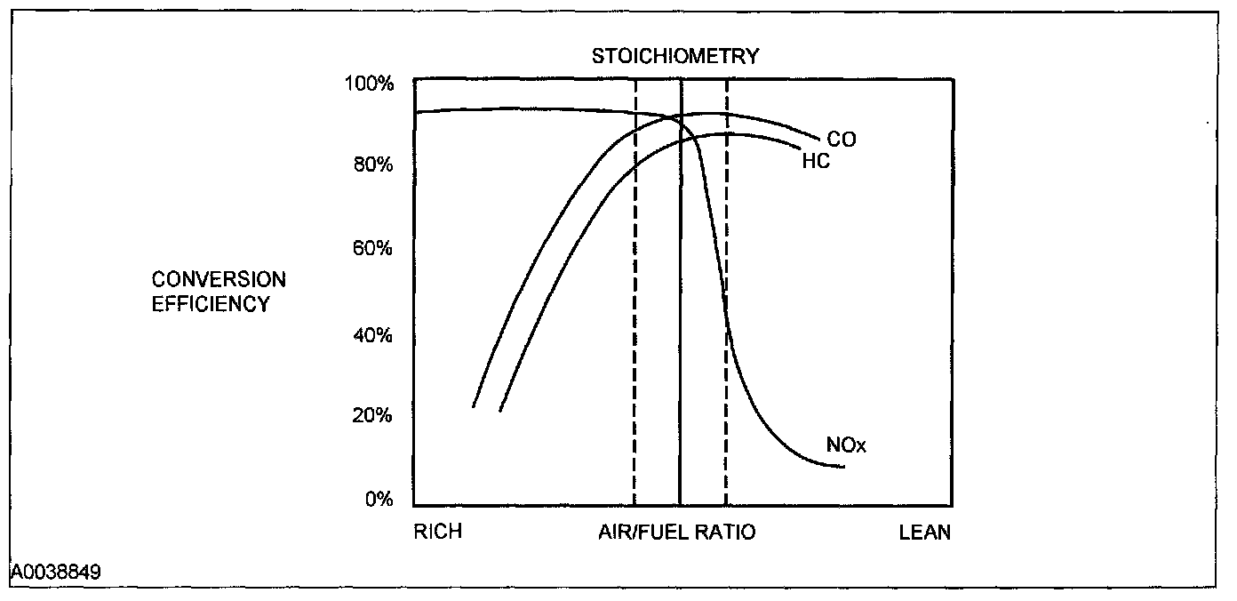 A TWC requires a stoichiometric fuel ratio, 14.7 pounds of air to 1 pound of fuel (14.7:1), for high conversion efficiency. In order to achieve these high efficiencies, the air/fuel ratio must be tightly controlled with a narrow window of stoichiometry. Deviations outside of this window greatly decrease the conversion efficiency. For example a rich mixture decreases the HC and CO conversion efficiency while a lean mixture decreases the NOx conversion efficiency.