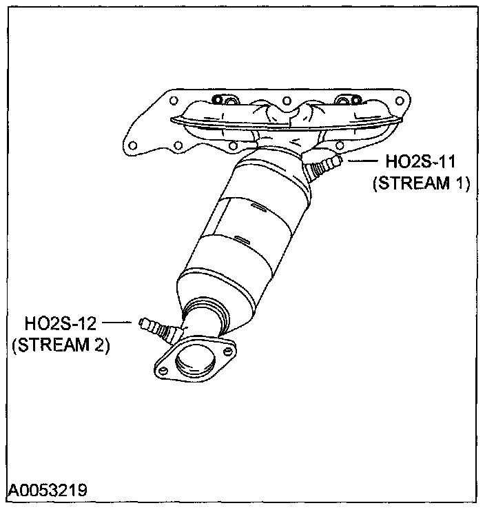 The exhaust system consists of an exhaust manifold, front exhaust pipe, upstream heated oxygen sensor (HO2S), rear exhaust pipe, downstream HO2S, a muffler and an exhaust tailpipe. The catalytic converter is installed between the front and rear exhaust pipes. Catalytic converter efficiency is monitored by the OBD II system.