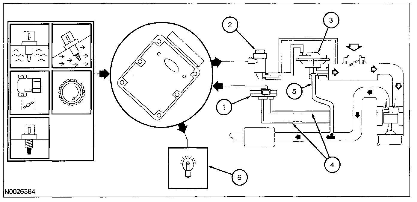4. The differential pressure feedback EGR sensor hoses are tested once per drive cycle for disconnection and plugging. The test is carried out with the EGR valve closed and during a period of acceleration. The PCM momentarily commands the EGR valve closed. The monitor looks for the differential pressure feedback EGR sensor voltage to be inconsistent for a no flow voltage. A voltage increase or decrease during acceleration while the EGR valve is closed may indicate a malfunction with a signal hose during this test.