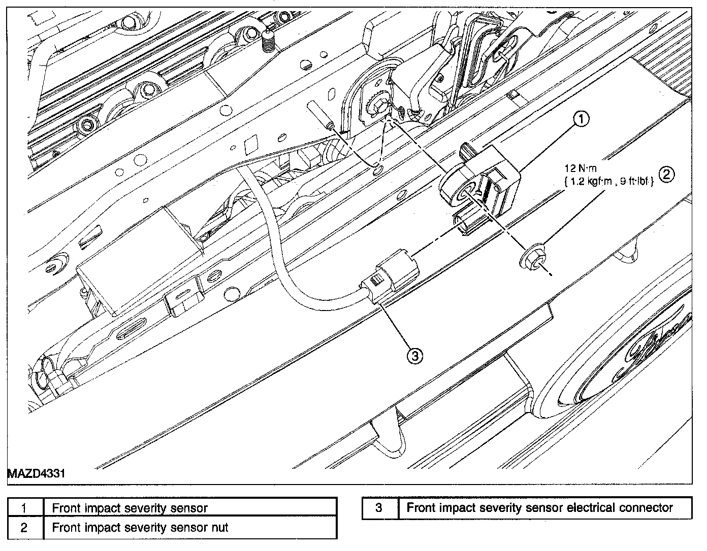 WARNING: The tightening torque of the front impact severity sensor retaining nut is critical for correct system operation. Failure to follow this Instruction may result In serious personal injury.