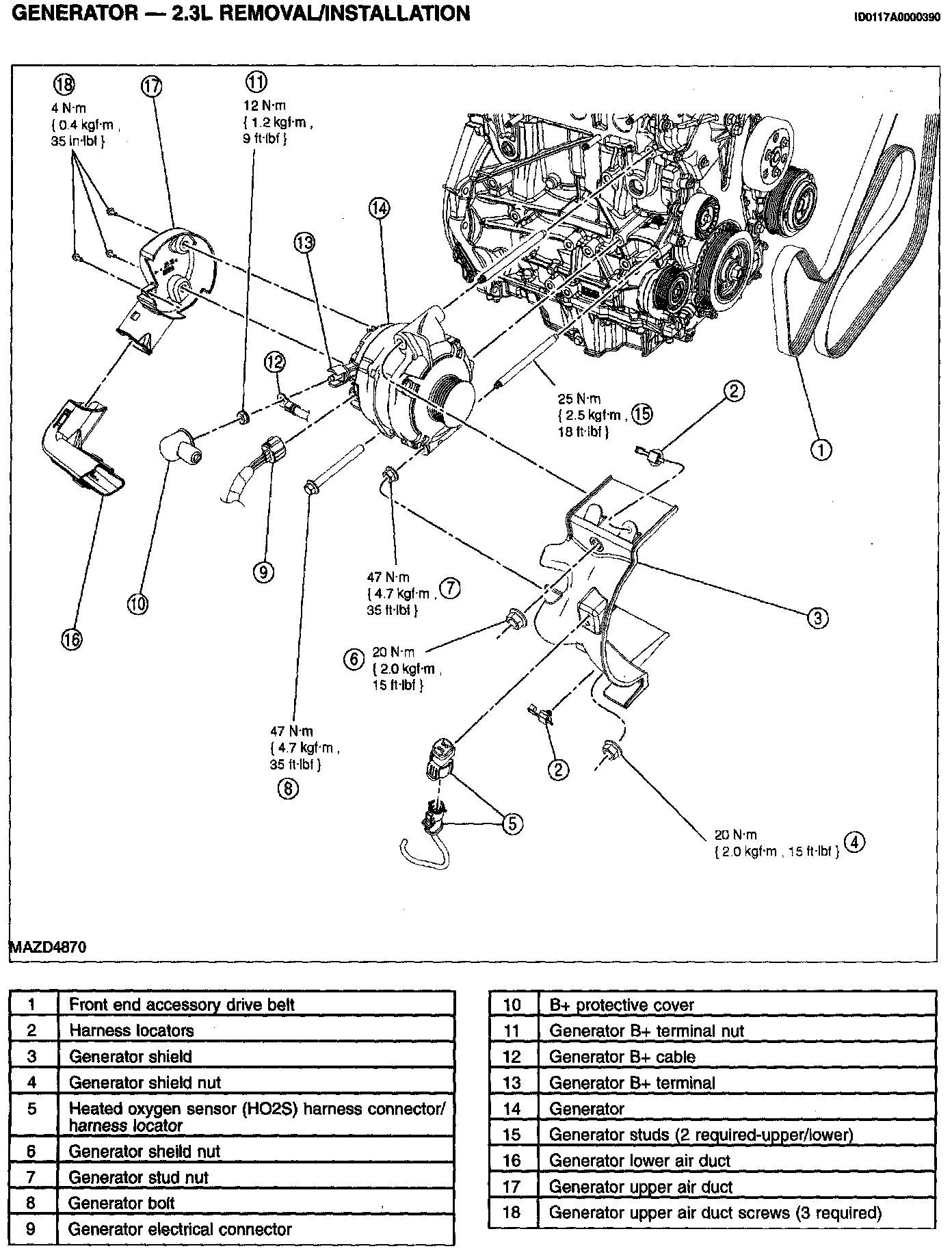 GENERATOR - 2.3L REMOVAL/INSTALLATIONCAUTION: Do not allow any metal object to come in contact with the generator housing and internal diode cooling fins. A short circuit may result and burn out the diodes. Failure to follow this instruction may result in component damage.