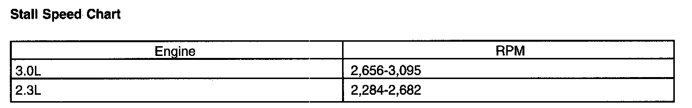 2. Press accelerator pedal to floor (WOT) in each range. Record rpm reached in each range. Stall speeds should be in appropriate range.