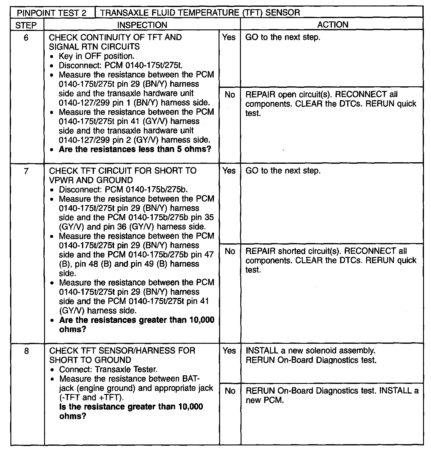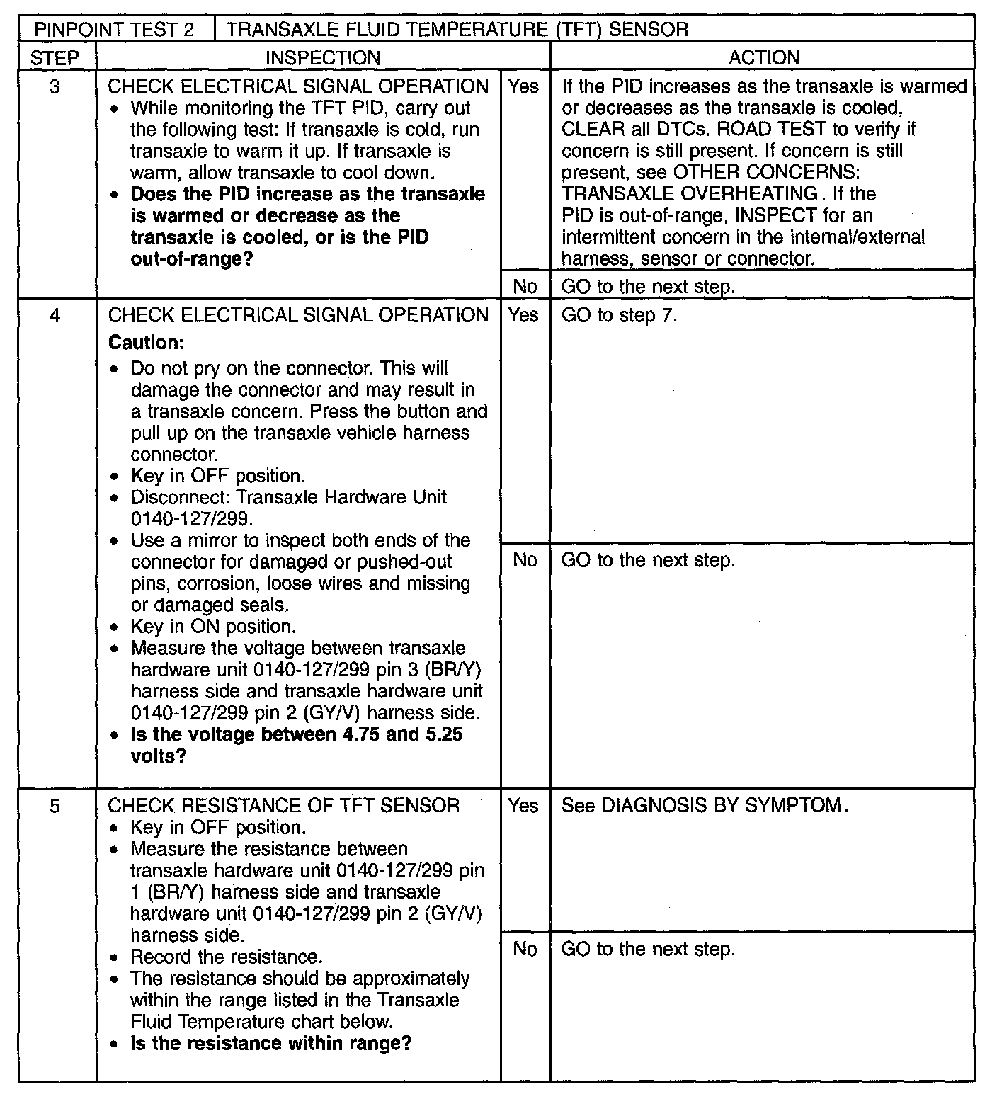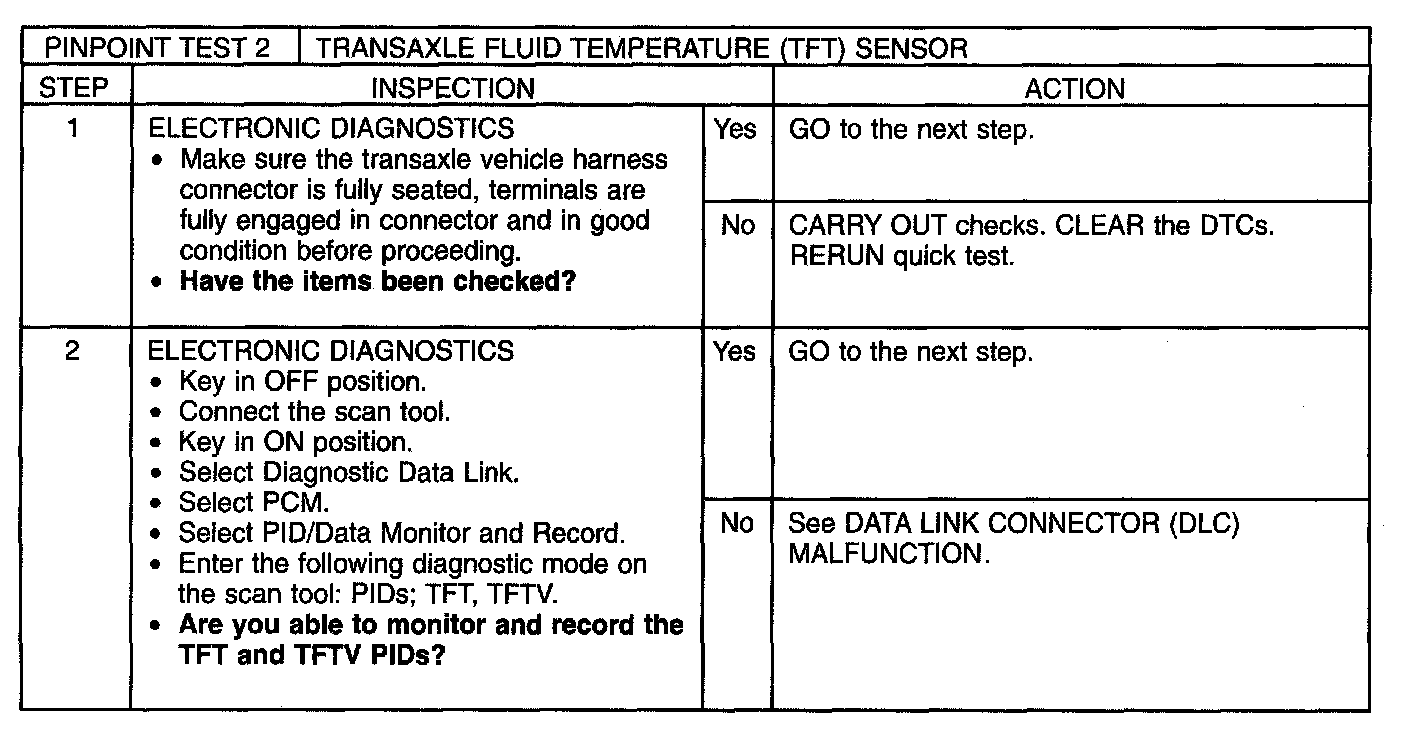 PINPOINT TEST 2: TRANSAXLE FLUID TEMPERATURE (TFT) SENSOR