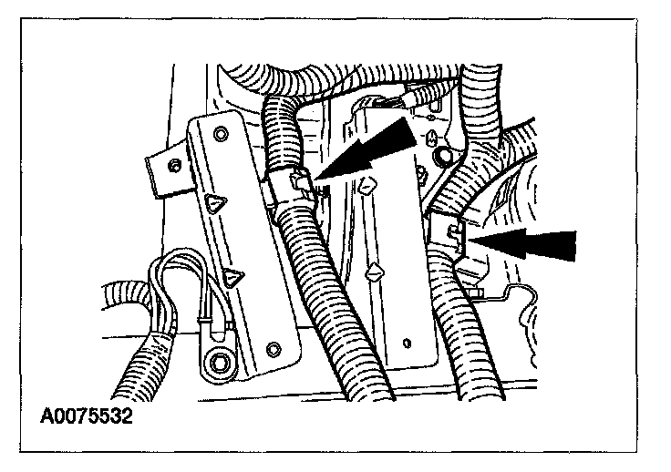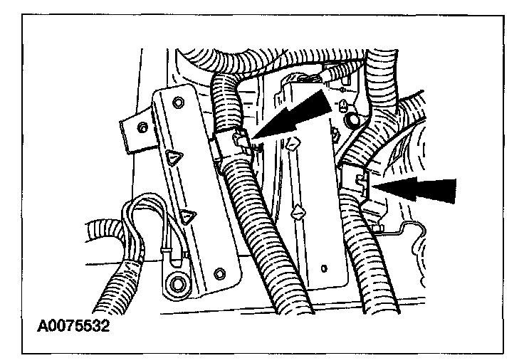 2. Depress the retaining tabs and push the solenoid valve body electrical connector up through the transaxle case.