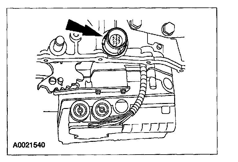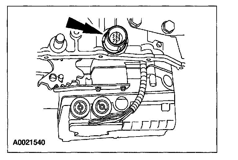 16. Depress the retaining tabs and push the solenoid valve body electrical connector down through the transaxle case.