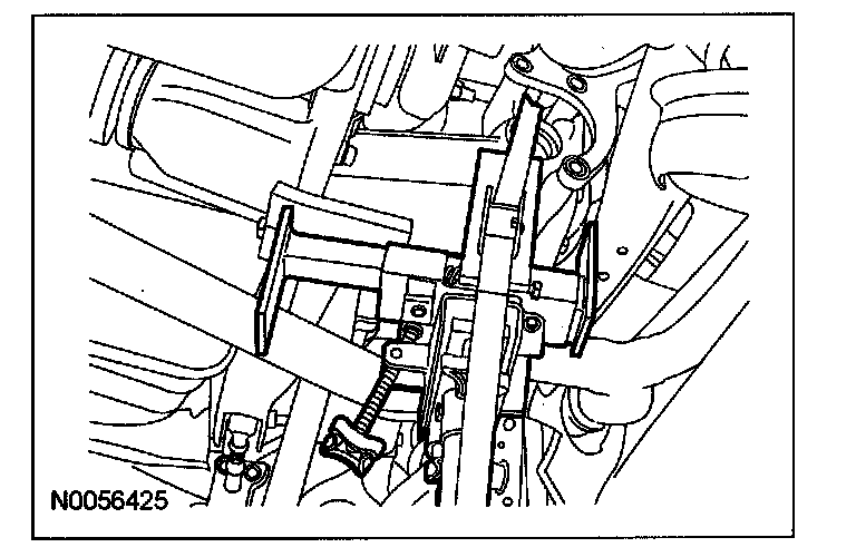3. Position a suitable transmission hydraulic jack to the axle housing. Securely strap the jack to the housing.