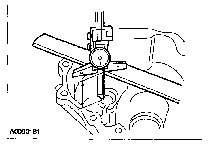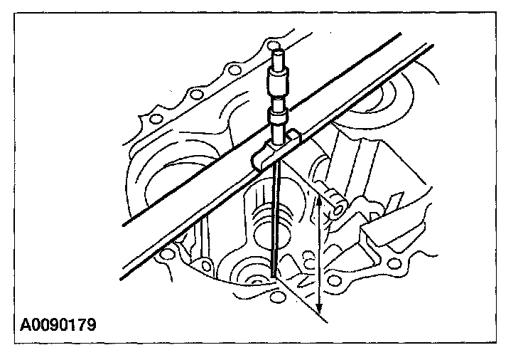 54. Using a depth micrometer and a straightedge, measure and record the depth from the mating surface of the clutch housing to the reverse idler shaft bearing surface. Record this measurement as L2.
