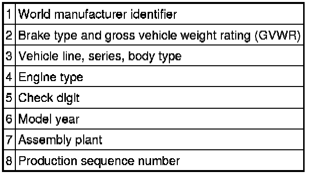 The fourth VIN position is the vehicle brake type and gross vehicle weight rating (GVWR) code, all vehicles use hydraulic brakes and driver and front passenger air bags.