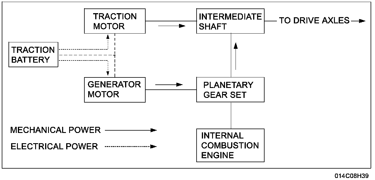 The hybrid electric system consists of 3 key components: the internal combustion engine, the electronically controlled continuously variable transaxle (CVT), and the high voltage traction battery. In this powertrain configuration, there are 2 power sources that are connected to the driveline: a combination of the engine and the generator which uses a planetary gear set to connect to each other, and the electric traction motor which is connected to the drive wheels.