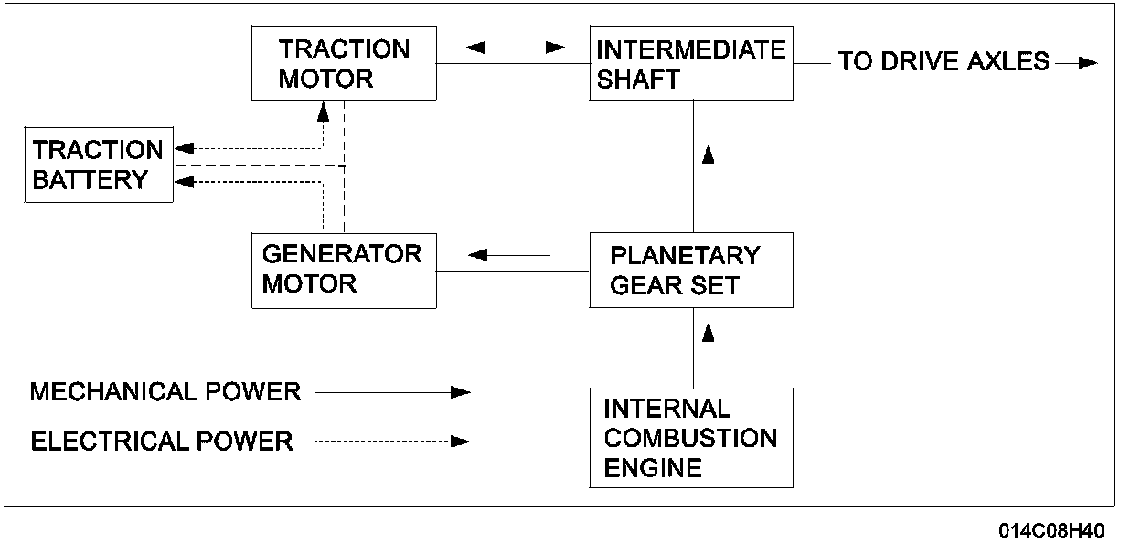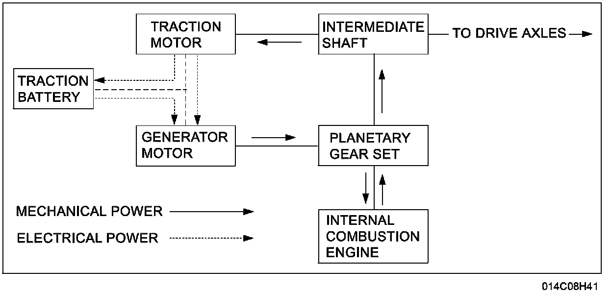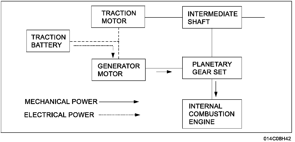 There are 2 paths for the engine to deliver its output power: from the engine to the carrier gear, to the ring gear, to the intermediate shaft (mechanical path), and from the engine to the carrier, to the sun gear, to the ring gear and to the intermediate shaft (electrical path). The combination of the mechanical and the electrical paths makes this powertrain similar to a conventional vehicle powertrain with a CVT.