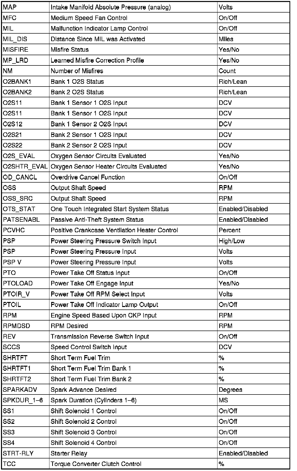 PID/Data Monitor Item Table