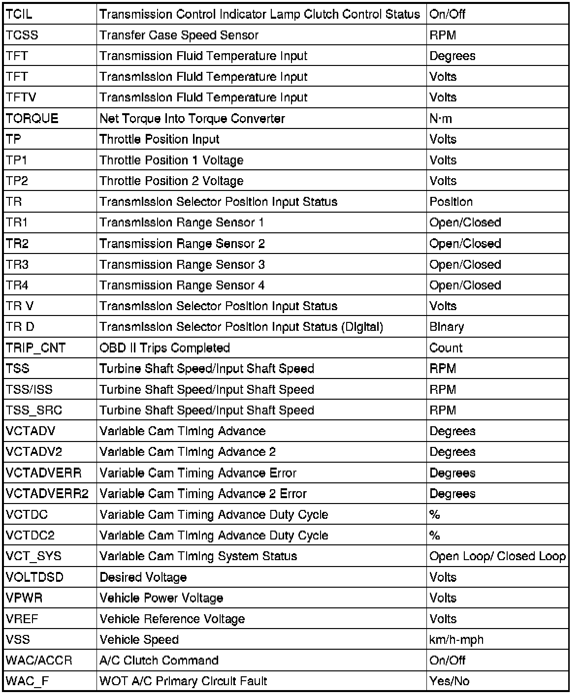 An X in the Freeze Frame column denotes both a mode 1 and mode 2 PID (real time and freeze frame).