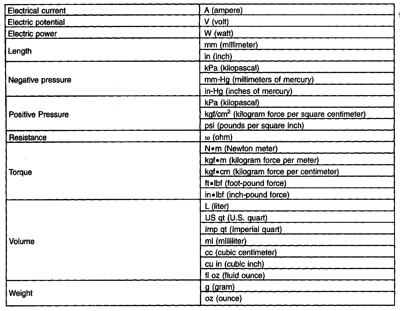 - All numerical values in this manual are used on SI units. Numbers shown in conventional units are converted from these values.