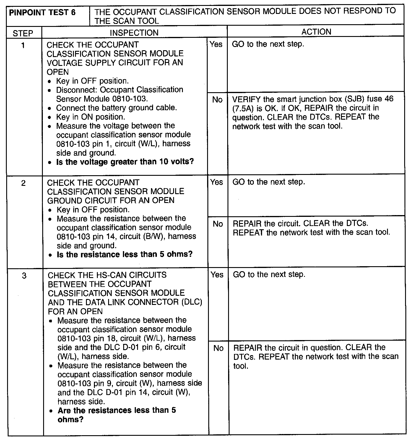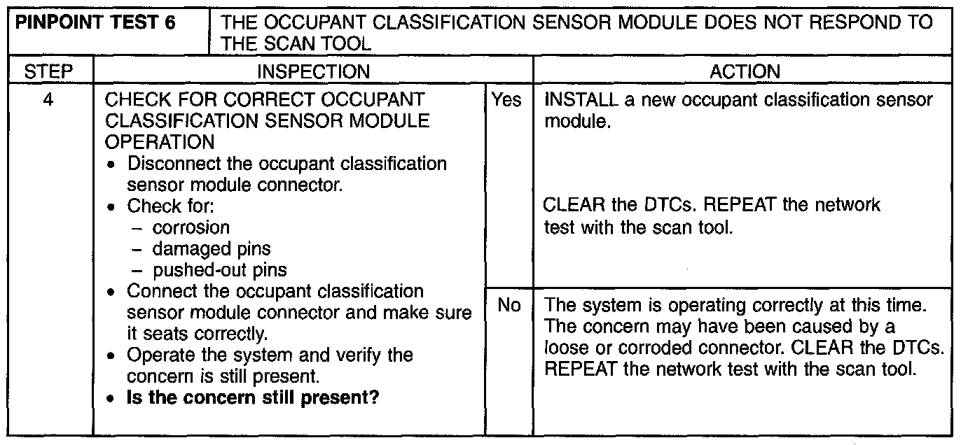 PINPOINT TEST 6: THE OCCUPANT CLASSIFICATION SENSOR MODULE DOES NOT RESPOND TO THE SCAN TOOL