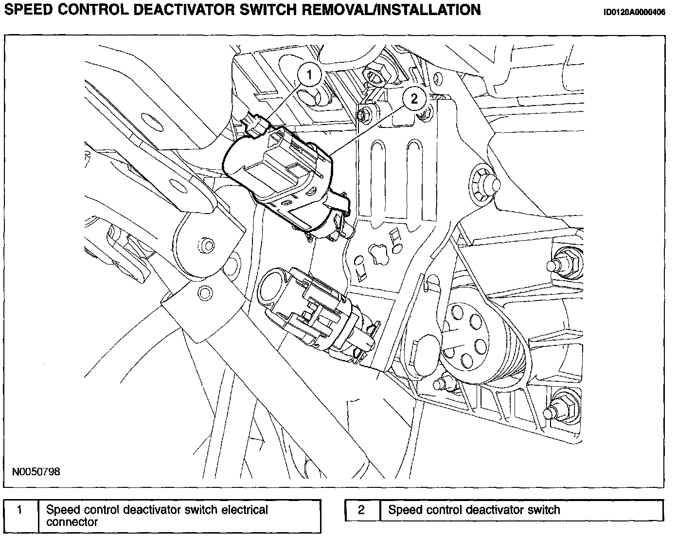 SPEED CONTROL DEACTIVATOR SWITCH REMOVAL/INSTALLATIONCAUTION: Do not service the brake pedal, brake booster, or master cylinder without first removing the speed control deactivator switch. Do not press or pull on the brake pedal when installing or removing the speed control deactivator switch otherwise misadjustment or damage to the switch may occur. Do not install the speed control deactivator switch without the brake pedal arm secured to the brake booster push rod.