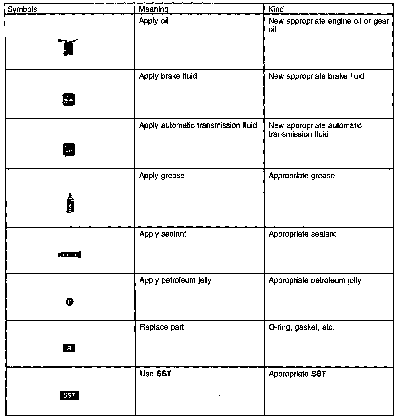There are 8 symbols indicating oil, grease, fluids, sealant and special service tool (SST) use. These symbols show application points or use of these materials during service.