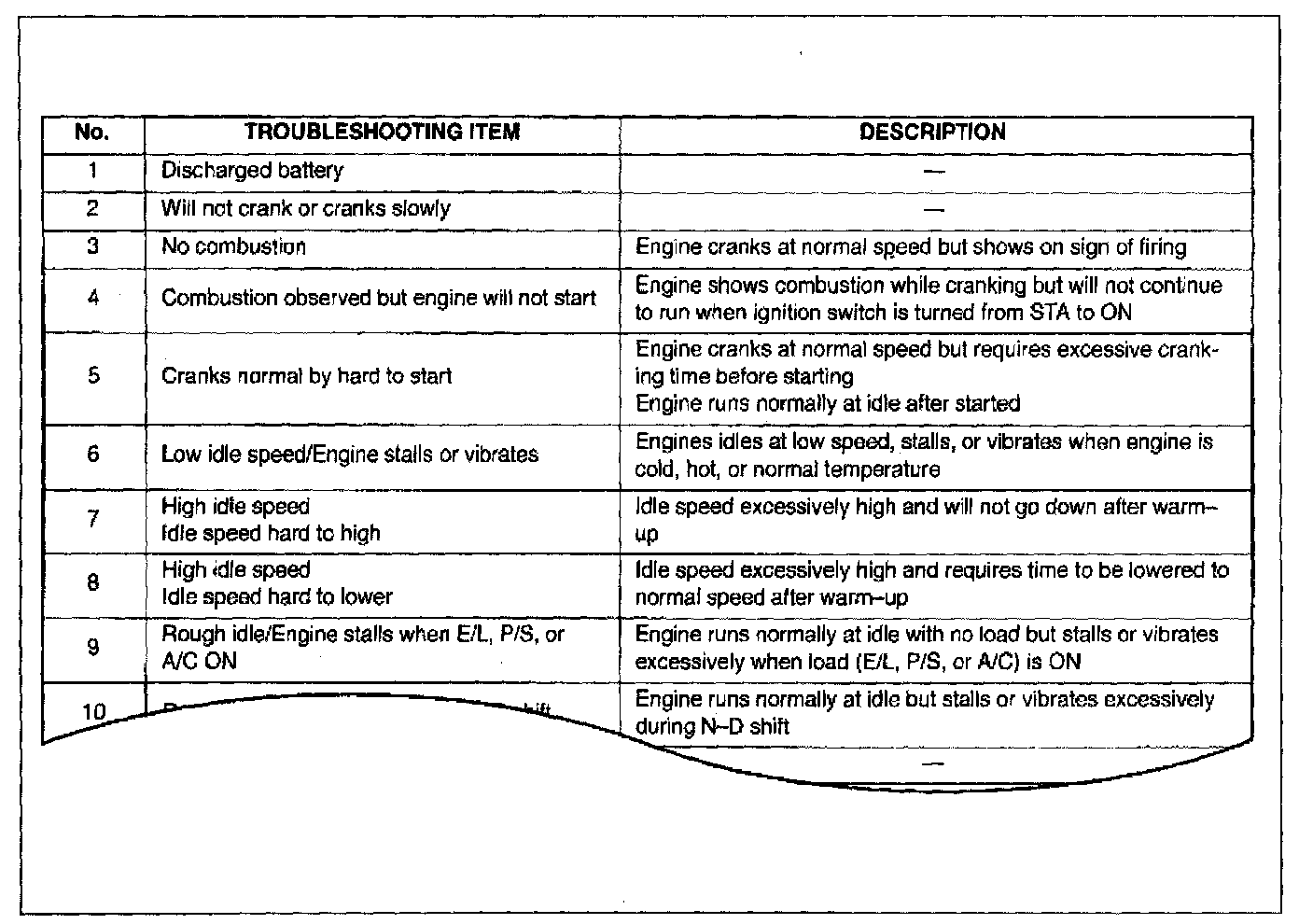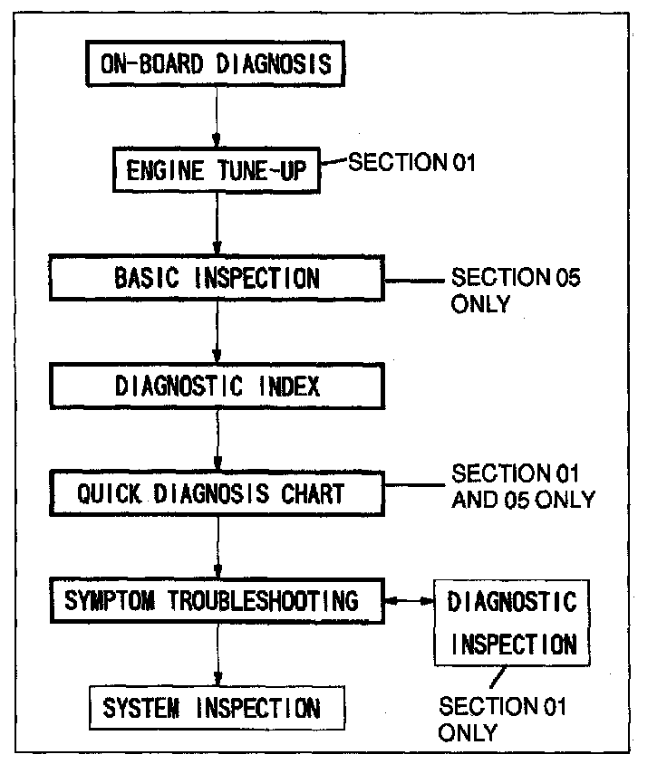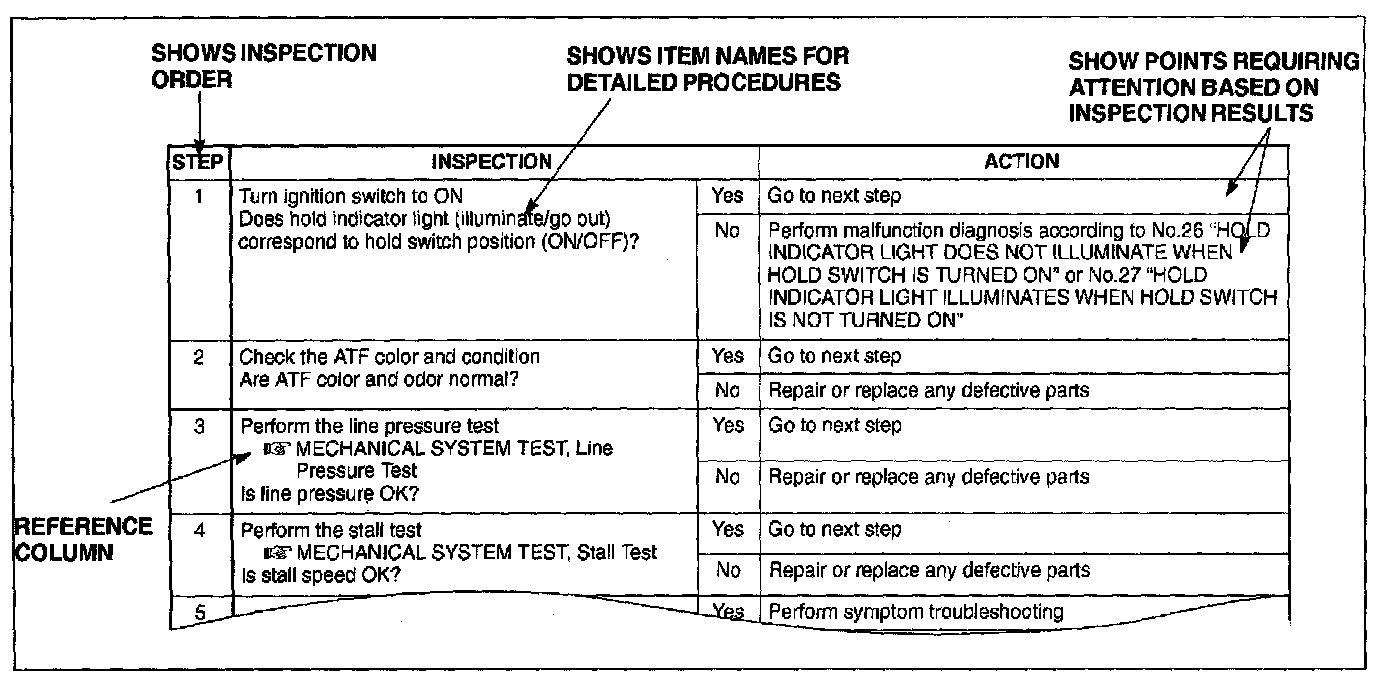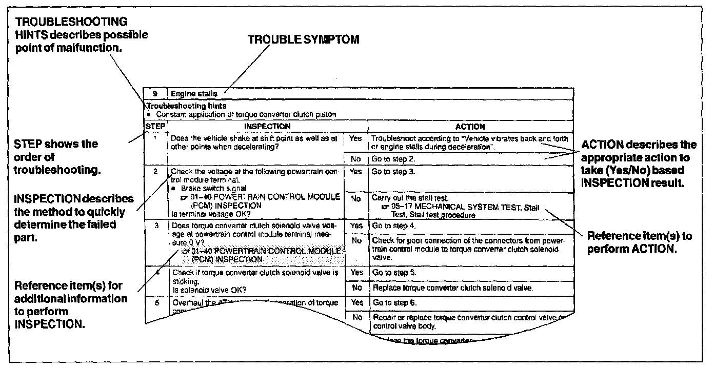- Symptom troubleshooting shows diagnostic procedures, inspection methods, and proper action to take for each trouble symptom.