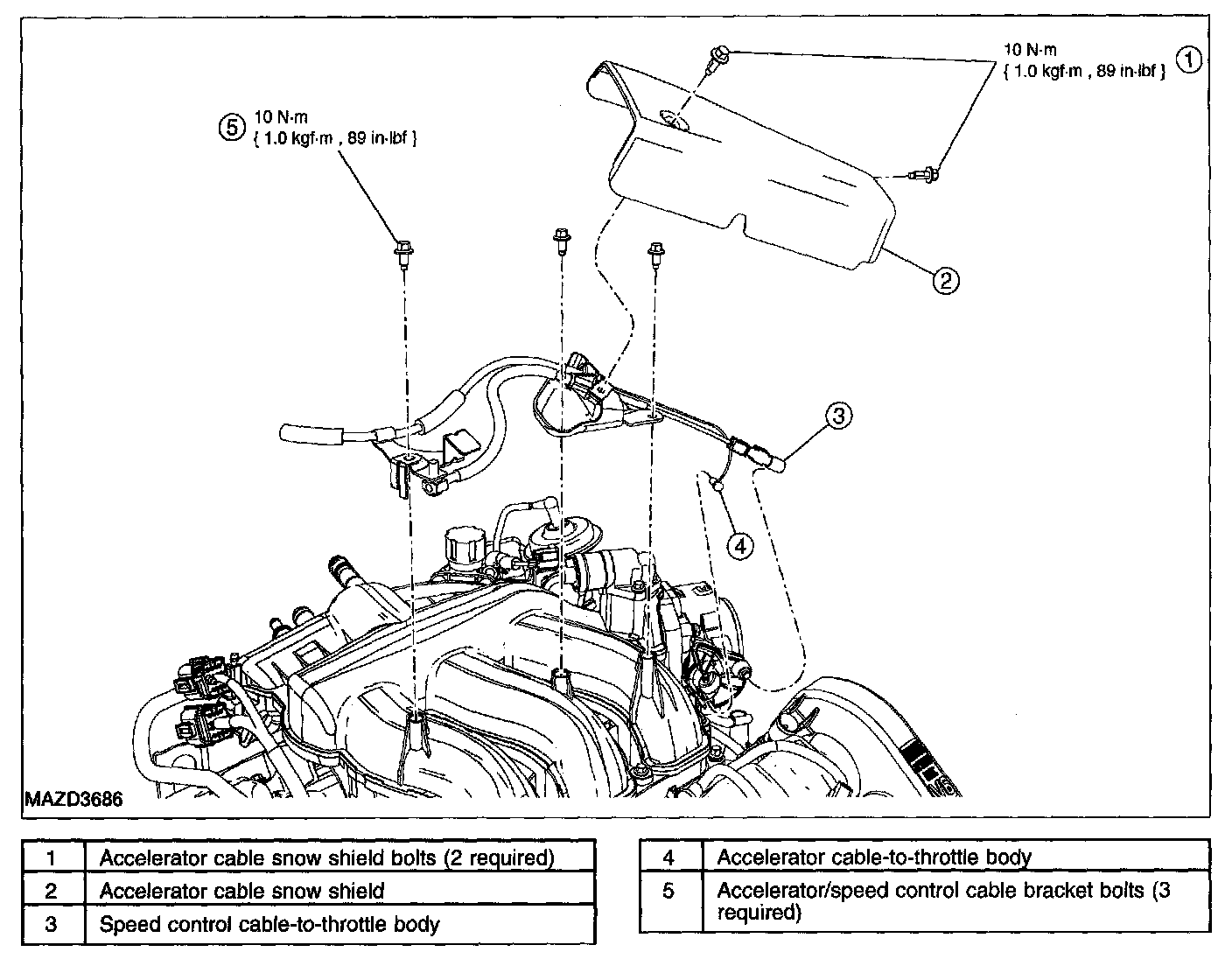 3. Remove the 2 bolts and the accelerator cable snow shield.