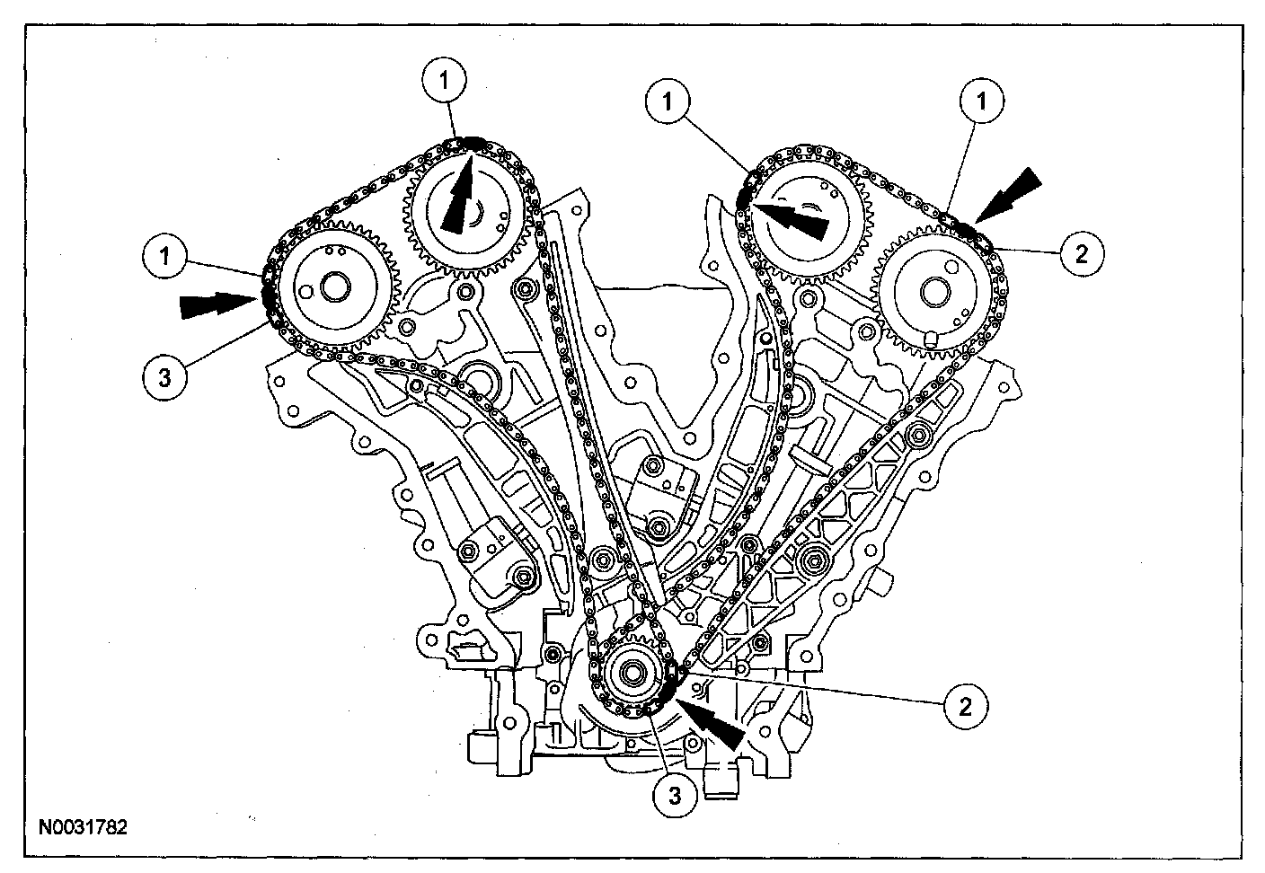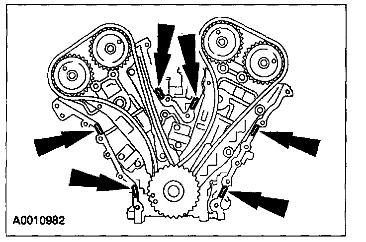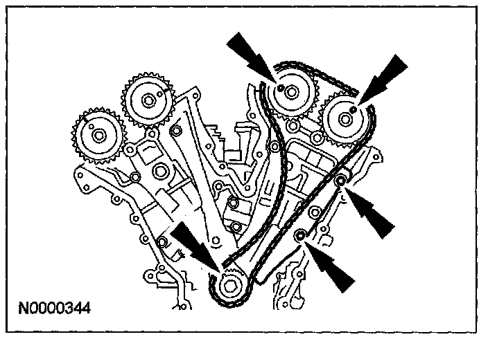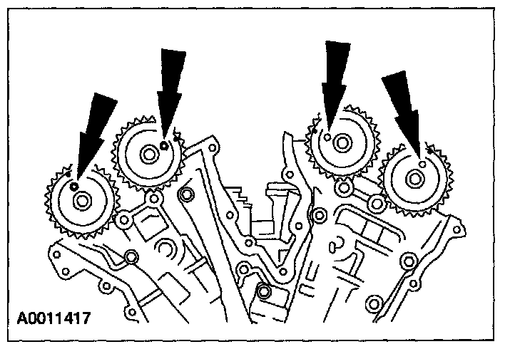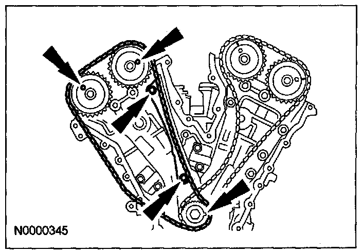 24. If the timing marks in the timing chains are not evident, use a permanent-type marker to mark the crankshaft and camshaft timing marks on the LH and RH timing chains.