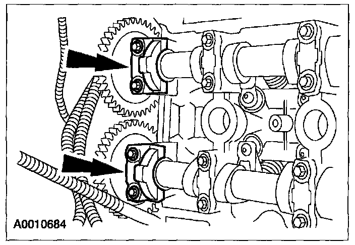 11. Lubricate the bearing surfaces of the LH camshaft thrust bearing caps with clean engine oil and install the bearing caps.